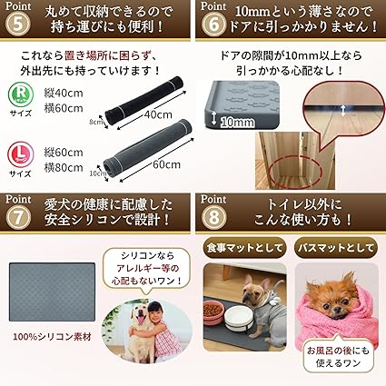 エッジデザイン: 6mmの余裕のある高さのエッジは液体がこぼれる心配が無く、角の部分は丸めに仕上げられており、汚れも容易に取れます。 滑らない加工: 密着力が強いシリコンマットは排便パッドを乗せても散らばる心配が無く便利です。 環境にやさしい: 100%シリコン素材で作られ、匂いも無く、環境ホルモンの心配もないのでペットの食事用のマットとしても活用できます。 お手入れ簡単: 耐熱性が高いシリコン素材で、230℃の高温のお湯での熱湯消毒にも対応できます。プニプニしたシリコン素材のため、洗浄も形態も容易です。