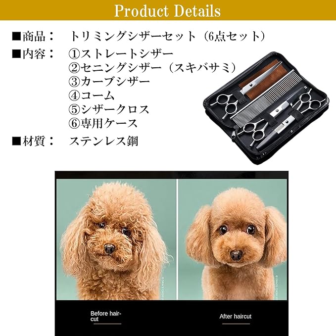 【ご自宅でトリミング】 トリミングシザーセット(6点)です。ペットの毛をカットするための基本ツールのセットとなっておりますので、可愛いペットの美容お手入れをご自宅で行うことができます。トリミングは、見た目を可愛くするだけではなく、健康と衛生を維持するために重要です。ご自宅での小まめなケアを行うのにお役立てください。 - トリミングのベーシックツール6点セットとなります。①ストレートシザー ②セニングシザー(スキバサミ) ③カーブシザー ④コーム ⑤シザークロス ⑥専用ケース - ストレートシザー(約19cm)はコームと合わせ、面を揃える仕上げカットをする時に使用します。カーブシザー(約19cm)は自然な曲面を出すことができ、繊細なカットをする時に使用します。裏表で上カーブ下カーブの使い分けが可能です。セニングシザー(約18cm)は全体の毛の量を減らし自然な仕上がりにするスキバサミです。 - ブレードは油圧プレスで強く圧縮し、強度と耐摩耗性、切れ味に優れています。ハンドルはErgonomicDesign(人間工学)で長時間の使用でも疲れにくく操作性に優れ快適に作業を行うことができます。リング(指穴)の接触点はノイズキャンセリング設計となっており、金属が当たる音でペットが怖がることがありません。 - 刃と刃を留めるネジは、凹凸のネジの場合、毛が絡み操作性が低下してしまいますが、本商品3本のシザーは皿ネジを使用しておりますので毛が絡まず快適に作業を行うことができます。 - 商品: トリミングシザーセット(6点セット) セット内容: ①ストレートシザー ②セニングシザー(スキバサミ) ③カーブシザー ④コーム ⑤シザークロス ⑥専用ケース 材質: 3crステンレス鋼 ※モニターの環境等により、色の見え方に若干差が生じる場合がございます。予めご了承ください。